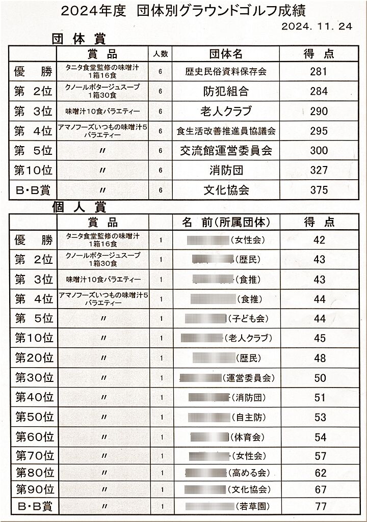 で、肝心の成績表ですけど、嫁さん達の食推チームは団体4位でしたから、その賞品ですネ。6名分ですから、数量の多いのも納得です(^-^)午後、メンバー5人に配ってくる…と言っておりました。