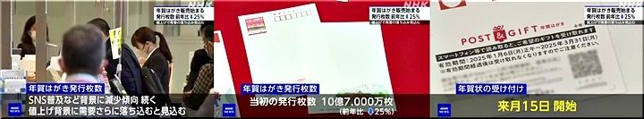 このため来年・令和7年用の年賀はがきの当初の発行枚数は10億7,000万枚と前の年より25%減り、減少率は比較できる平成16年用以降で最も大きくなっています。