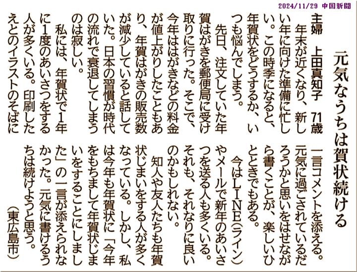自分から〝経費負担が感じられ…〟〝今年をもちまして年賀状とお別れ…〟とは言いにくい面がありますから、この方同様に『元気なうちは賀状続ける』事になりますのかも(^-^)