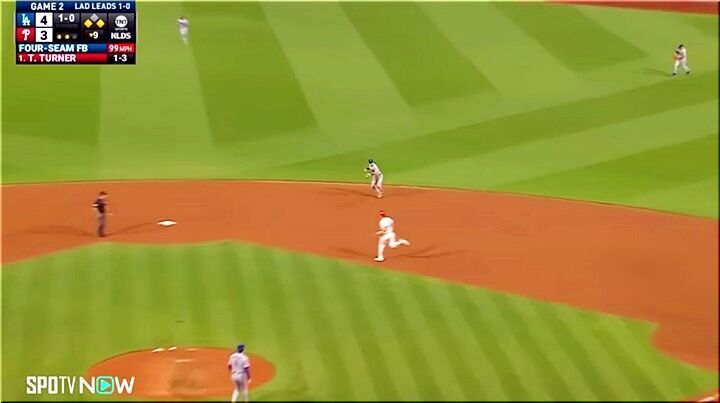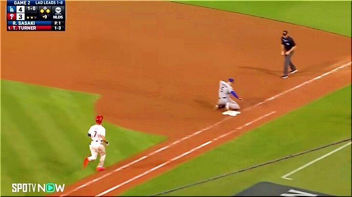 >ターナーが打ち返したものの二塁のトミー・エドマン内野手が捕球。やや送球が逸れたが、フレディ・フリーマン内野