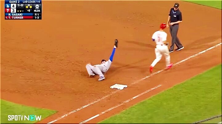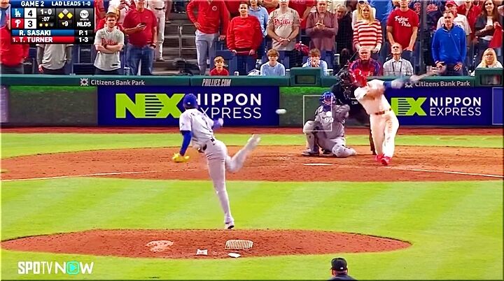 ドジャースは9回、3点差のリードがあったもののブレイク・トライネン投手が1死も取れずに2失点した。代わったアレックス・ベシア投手がどうにか2アウトまで取ると、右打者ターナーの場面で佐々木が起用された。地区シリーズ第1戦に続く、セーブ機会でのマウンドになった。