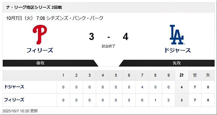 【MLB】ドジャース 4ー3 フィリーズ(日本時間7日・フィラデルフィア)