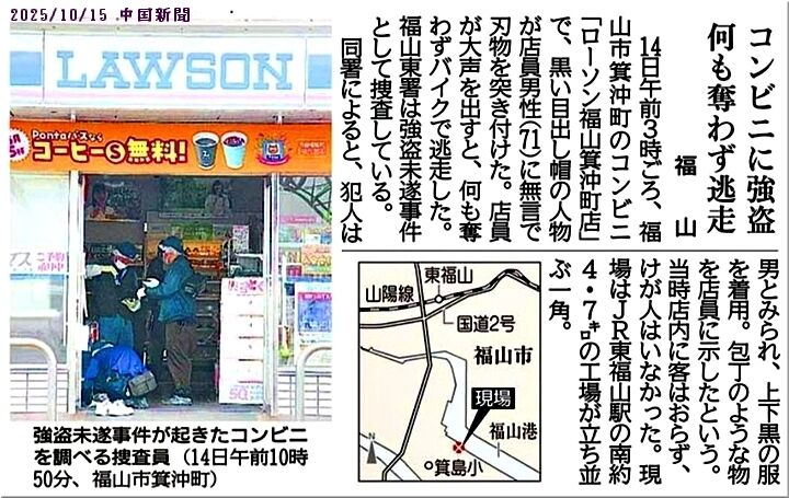 本日の中国新聞朝刊紙上にも、昨日の〝コンビニ強盗未遂事件〟の記事掲載がありましたけど、昨日のTVニュースと同じような内容で、犯人逮捕への進展はありませんようですネ。