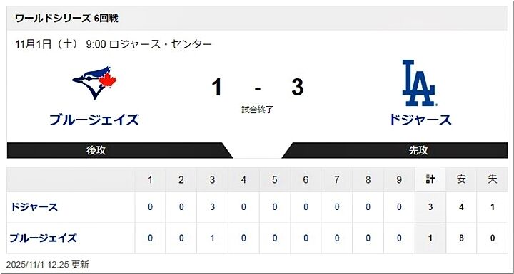 <ワールドシリーズ:ブルージェイズ1-3ドジャース> ◇日刊スポーツ ◇10月31日(日本時間11月1日)◇ロジャーズセンター