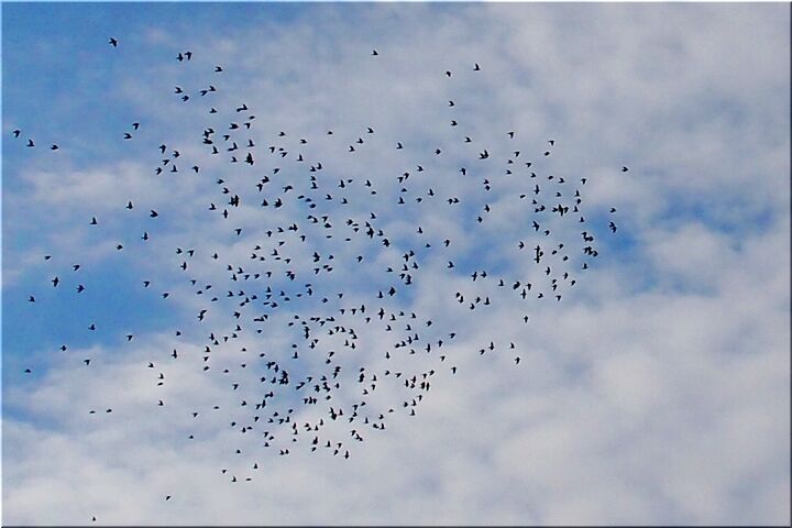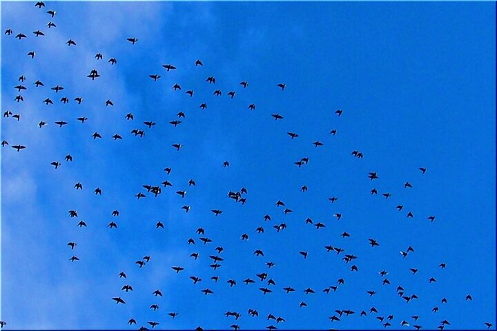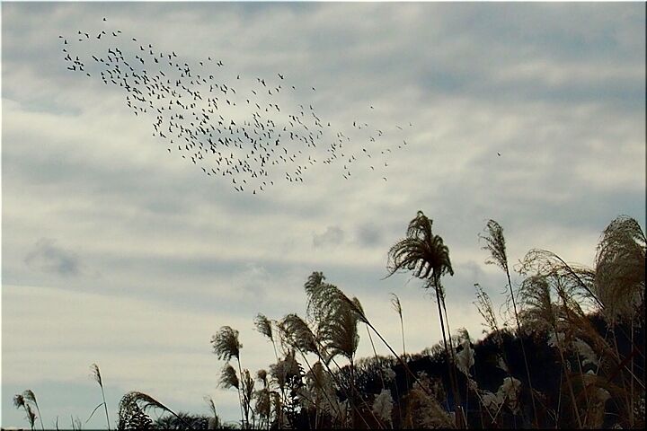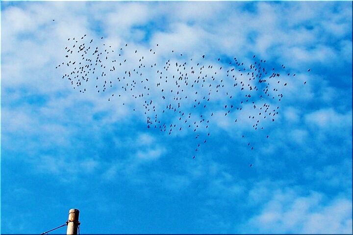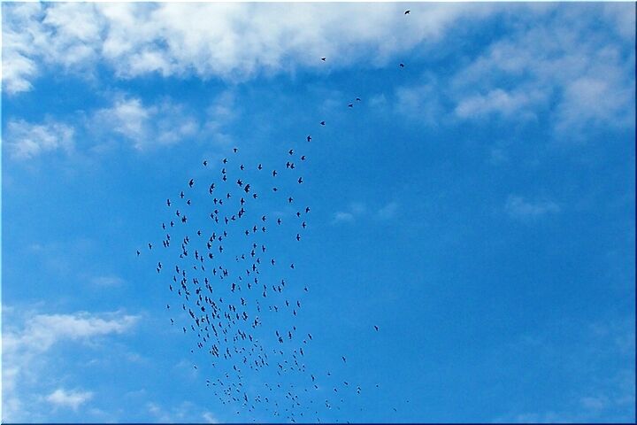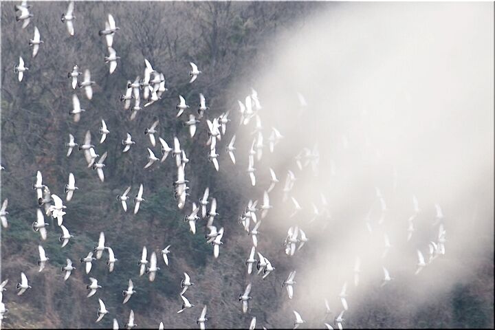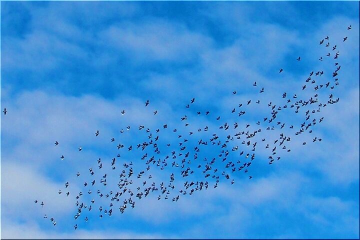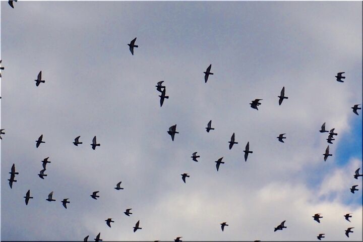 三グループが二つ、一つと、合体し、また三つに戻ったりと繰り返しておりますけど、この行動を、別段、リーダーがいて、リーダーの合図の元に右旋回、左旋回、グループを合体…と繰り返していますようには、とても見えません。リーダーの合図がなくても一斉に同じような行動を取っていますけど、これは実に不思議です。上空を旋回しながら、何で、ハトの皆さんは、一斉に同じ行動が瞬時に取れますのでしょう?