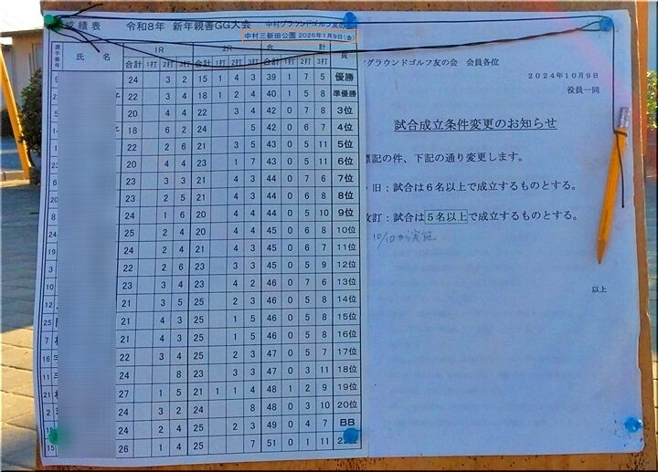 成績表の掲示がありましたので見てみますと、昨日の「新年GG大会」は、22名の皆様が参加され開催。12/25(木)から2週間ばかり冬季休暇で、昨日の再開でいきなり大会ですから、スコアの方は皆さん今一のようでありました。
