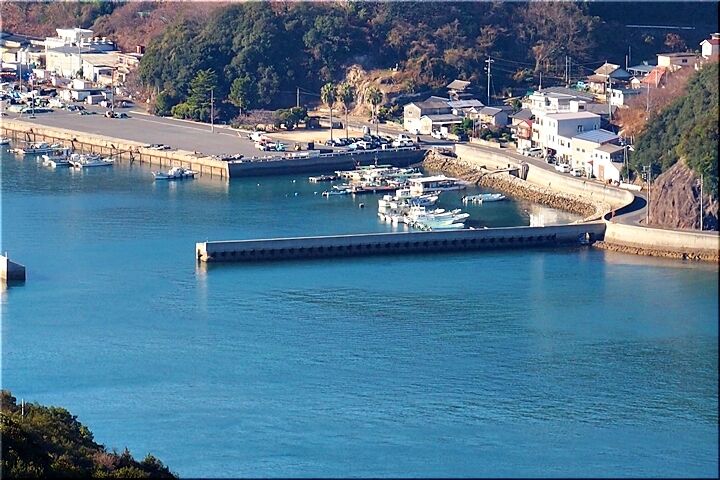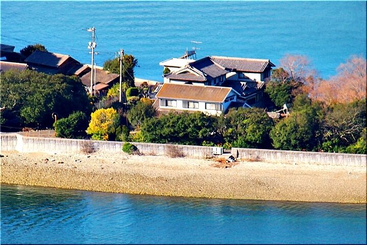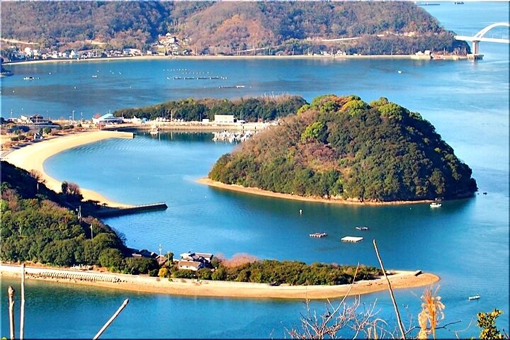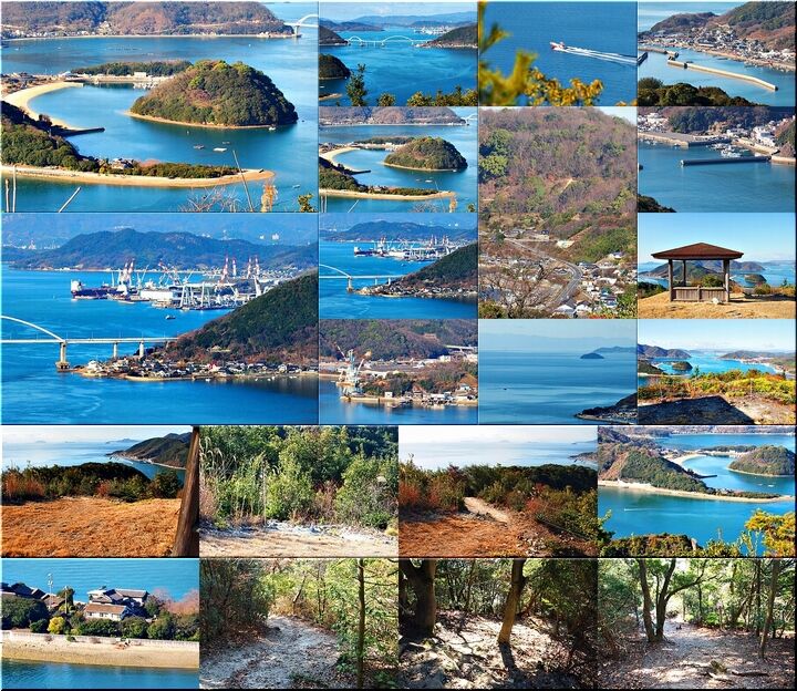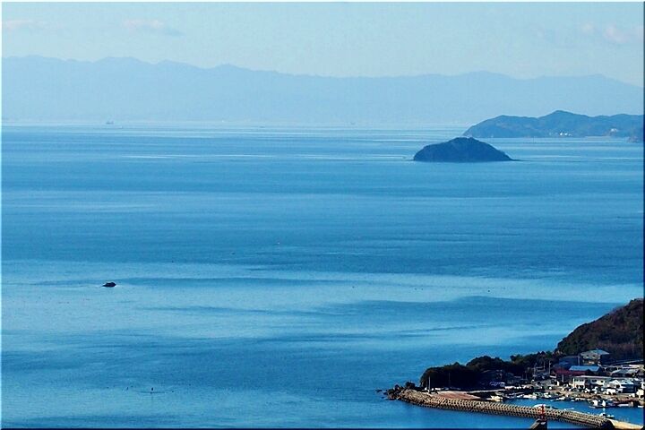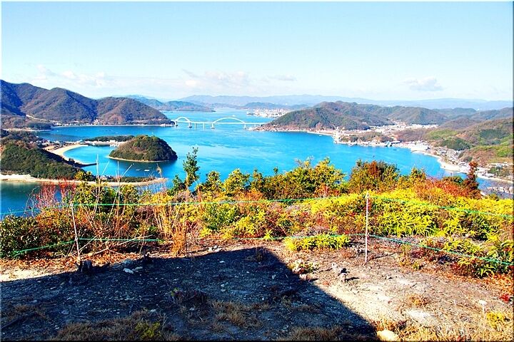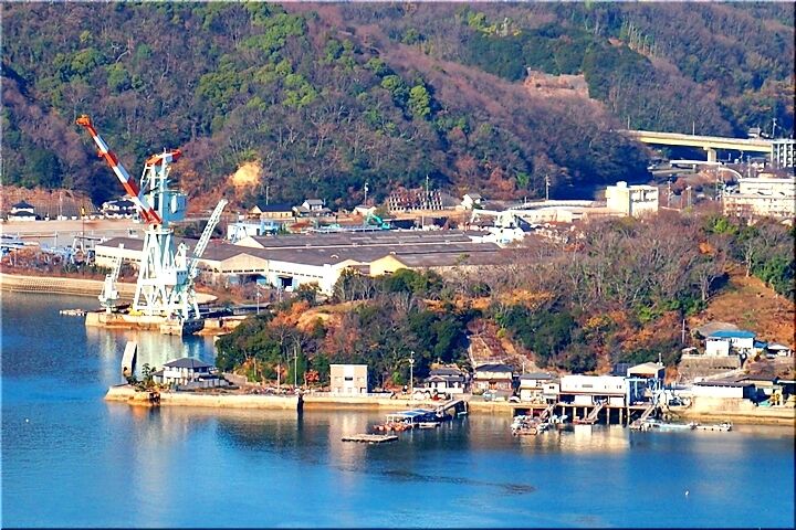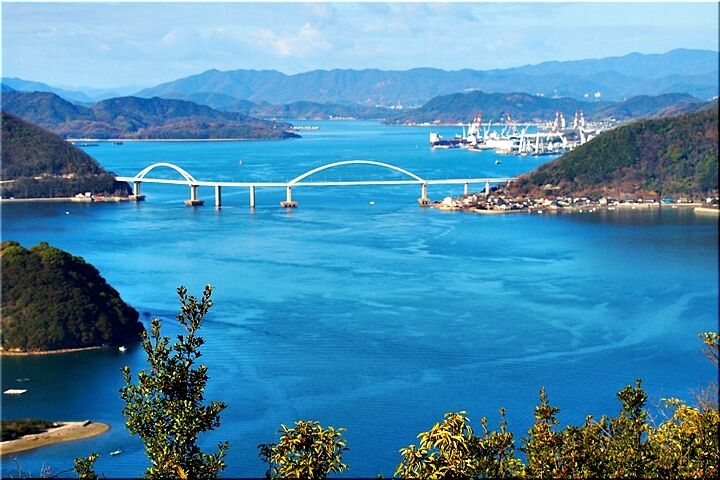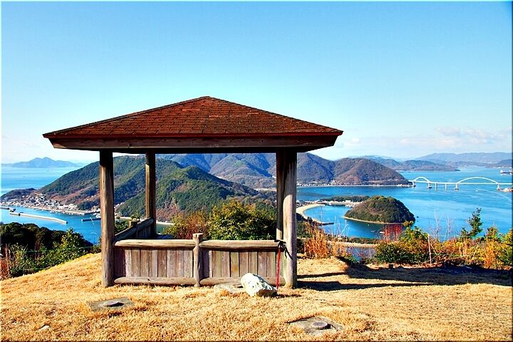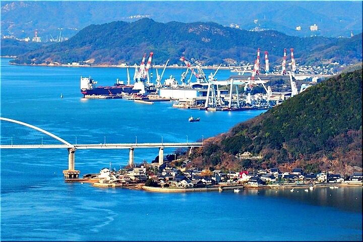 展望台からの眺望は、〝内海大橋〟の後方が〝常石造船〟で、内海大橋手前の小さな島が〝矢ノ島〟です。〝矢ノ島〟の左側の対岸が、〝田島〟の〝クレセントビーチ海浜公園〟であります。