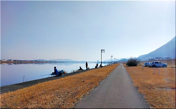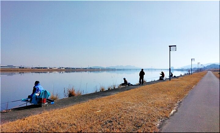 風がありませんから、波一つありません芦田川の川面。この川面に向かって4~5名の釣り人が…静かに沖合を見つめておられますけど、時たま釣り竿を上げ、エサの交換を(^-^)