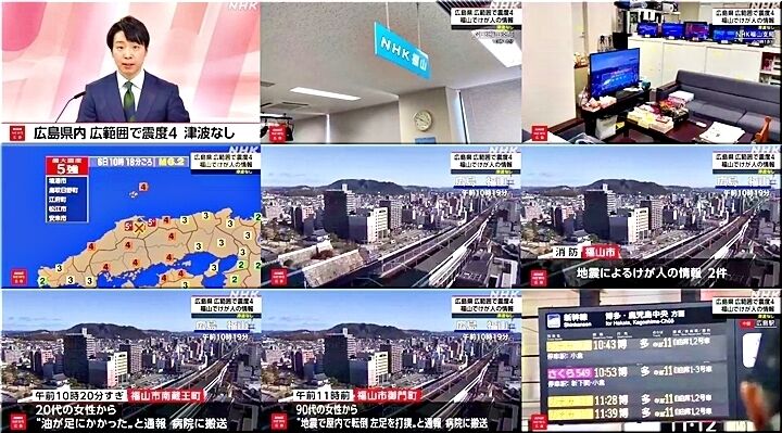 この地震で、広島県内では震度4を広島市安芸区、竹原市、三原市、尾道市、福山市、庄原市、江田島市、府中町、北広島町、大崎上島町、神石高原町で観測しました。