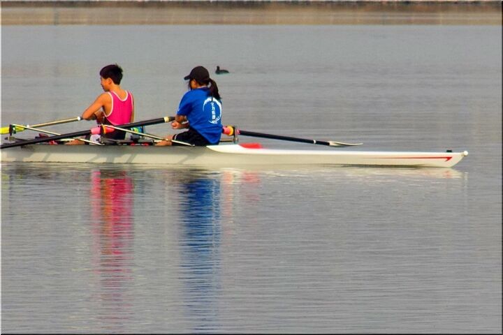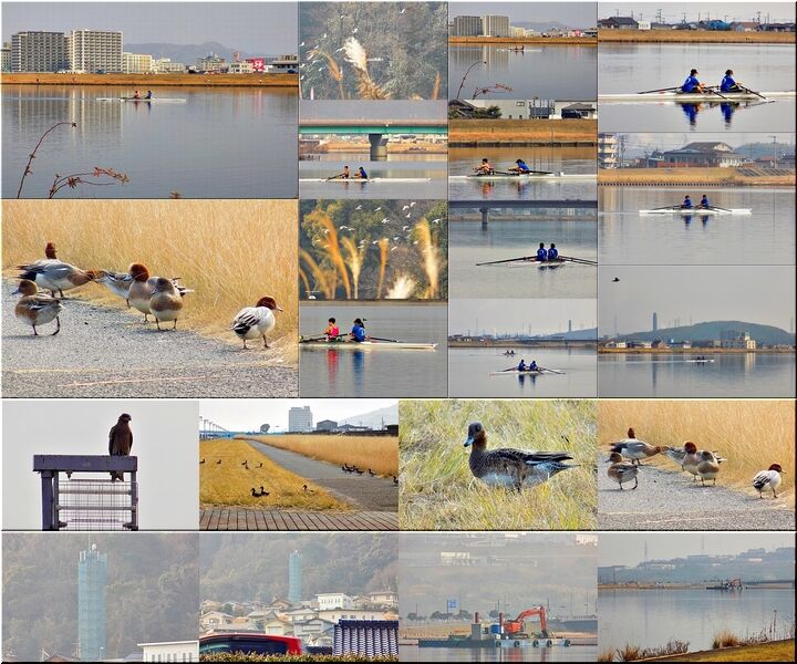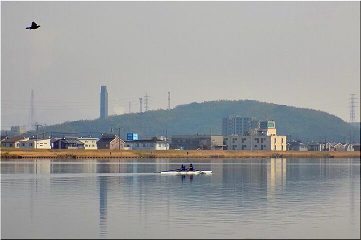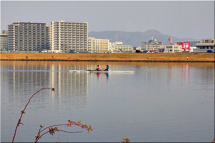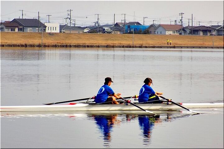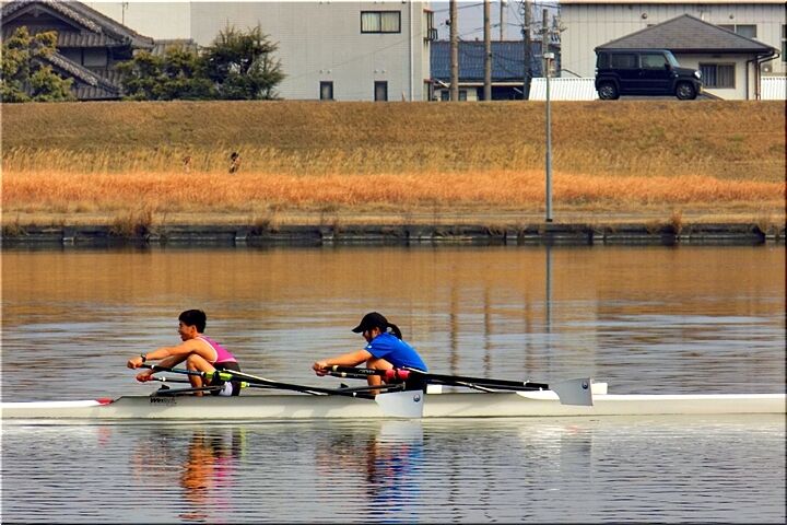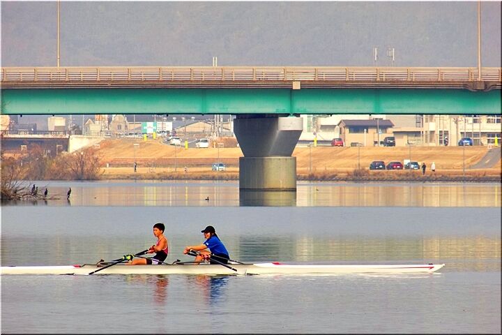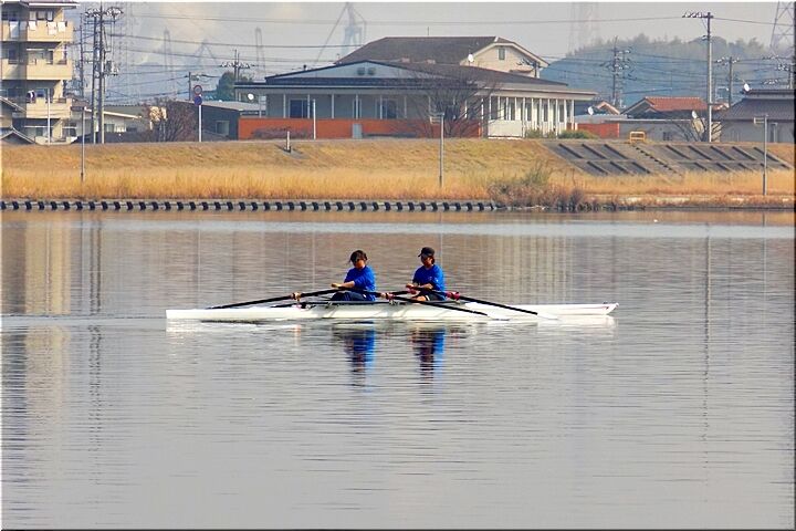 2艇とも、お二人とも、オールを右手と左手に1本ずつ合わせて2本持って漕いでおられますから、〝ダブルのスカル〟ですネ。この〝芦田川漕艇場〟では〝シングルスカル〟の練習光景は、よく見掛けますけど、〝ダブルスカル〟は珍しいかも…