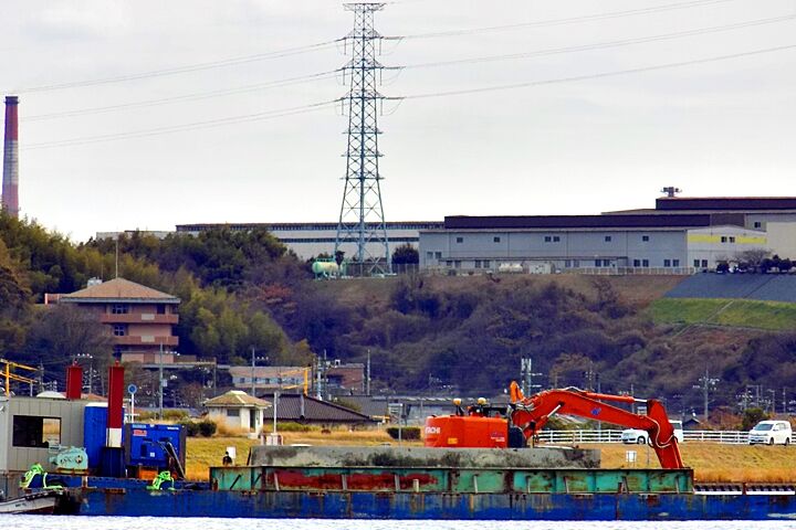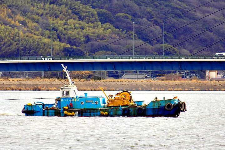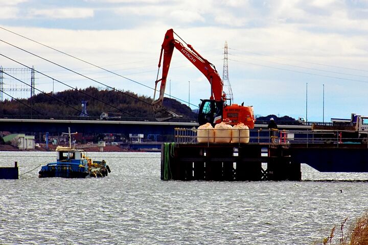 芦田川大橋から少しばかり上流の左岸側の河道の土砂を、クレーンで運搬船に掬い上げ、これをタグボートで右岸側に曳航し、運搬船の土砂をクレーンで陸揚げしダンプに積載です。