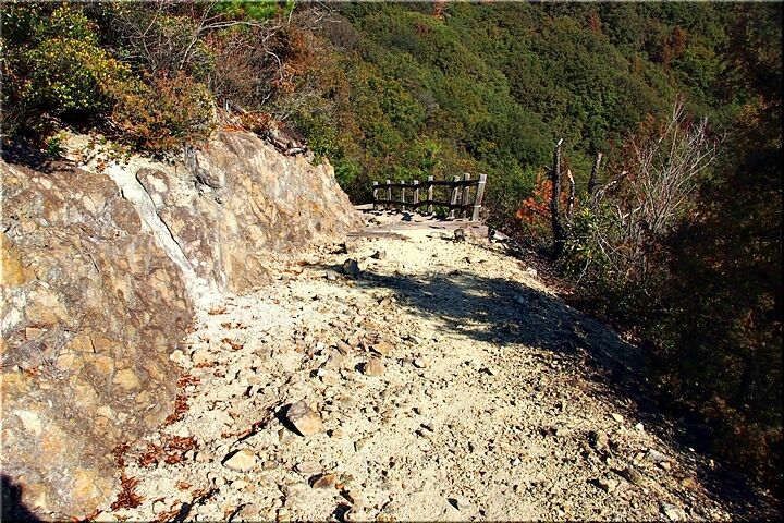 どちらのルートを選択しましても、また上がって来なければなりませんけど、左の〝南通り遊歩道〟方向に下りて行きまして、途中の分岐点で〝南通り遊歩道〟には向かわず〝尾根歩き遊歩道〟へ上がって行きます事に(^-^)