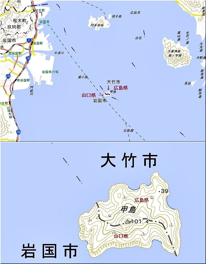 甲島(かぶとじま) 広島県大竹市 山口県岩国市 鉢ヶ峰の稜線に沿って県境。明治時代初め頃に境界線が決定したらしい。