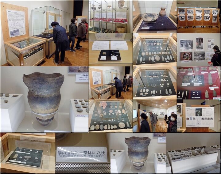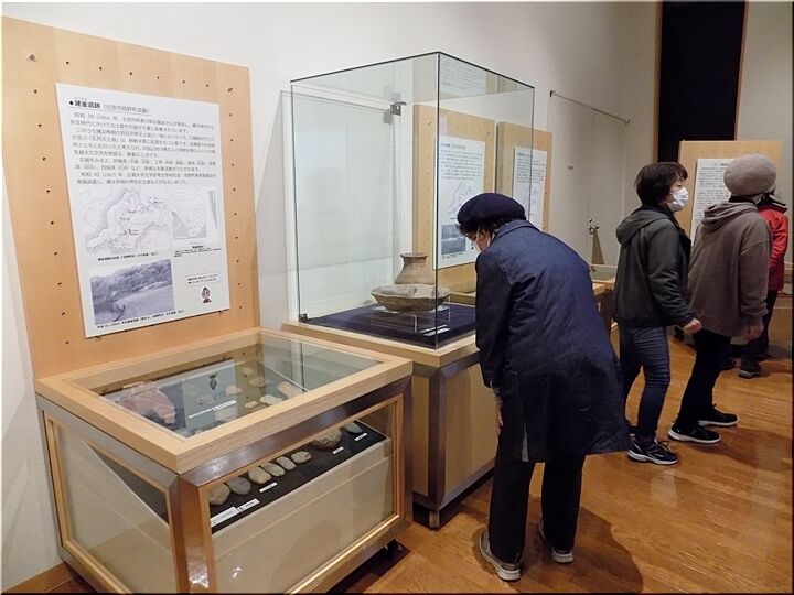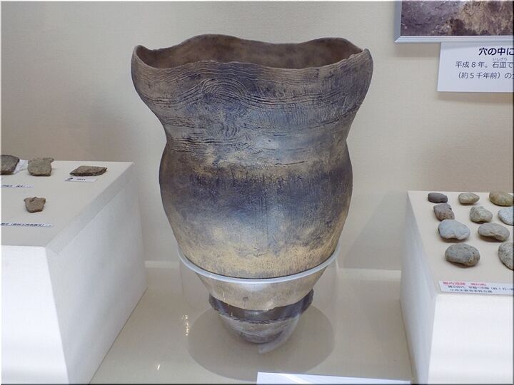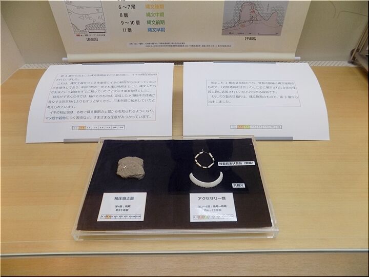 本遺跡は縄文から鎌倉時代にわたる複合遺跡で、特に縄文時代は早期から晩期に至る13層に及ぶ文化層から多量の遺物が整然と層序を成して出土したと云う。