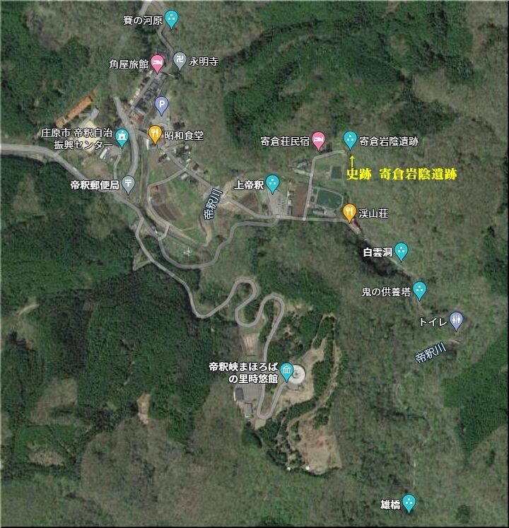 広島県庄原市東城町にある集落跡。1961年(昭和36)の調査によって、帝釈(たいしゃく)川北岸の山麓にある石灰岩地帯には、石器時代の岩陰・洞窟遺跡が多数分布することが明らかになった。この中で寄倉岩陰遺跡は最大規模で、石灰岩の岩陰に沿って全長30m、幅15m以上にわたる。縄文時代から鎌倉時代にかけての多量の遺物が堆積しているが、とくに縄文時代の遺物包含層は厚く、早期から晩期にいたる各種遺物が層をなして出土している。これらは中国・四国地方における縄文土器の編年の基準遺跡とされ、1969年(昭和44)に国の史跡に指定された。また、縄文時代後期から晩期ごろと考えられる人骨約50体が集められた状態で発見された。現在、遺跡は保存施設が設けられ、堆積層の一部を見学できる。遺跡は帝釈峡の鍾乳洞の白雲洞(はくうんどう)や石灰岩の雄橋(おんばし)などにも近い。中国自動車道東城ICから車で約20分。